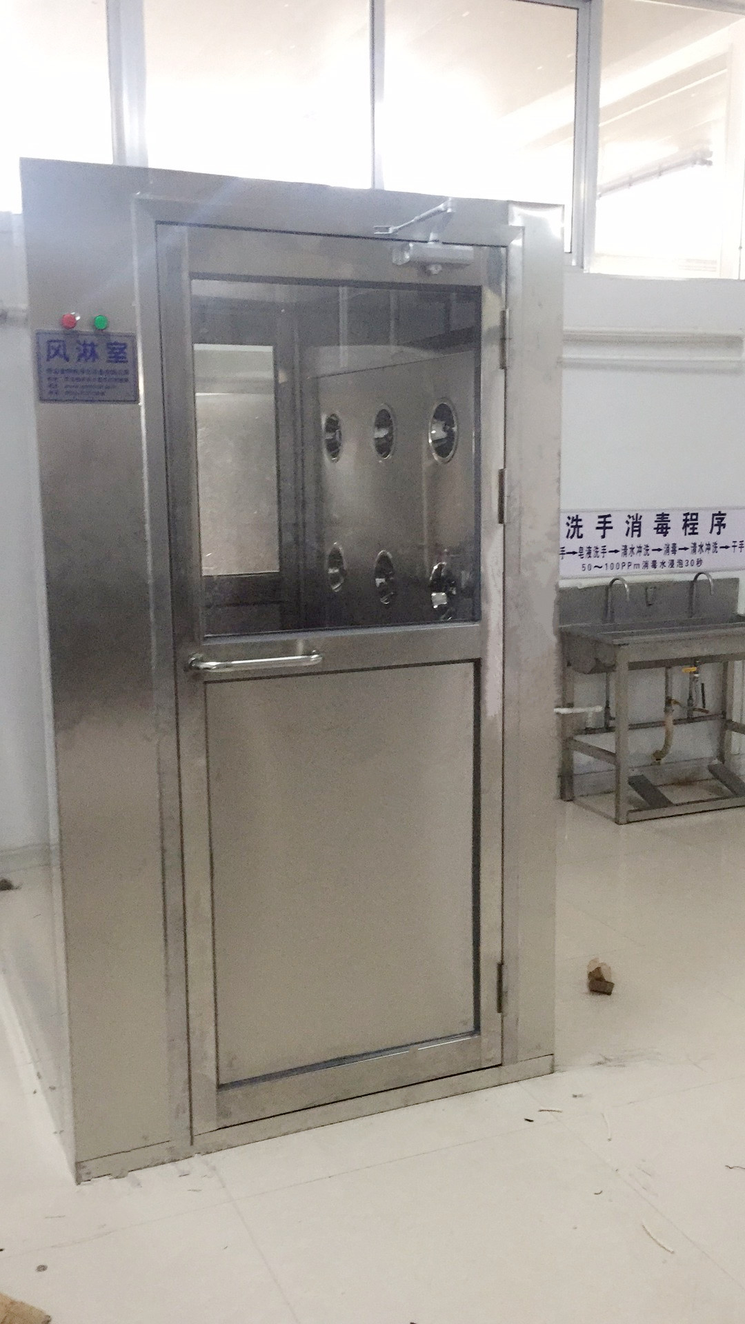 4、自動化控制,單人單吹風淋室系統(tǒng)采用PLC智能化的控制手段,控制面板上LED顯示屏可正確顯示風淋的運行狀態(tài)、雙門的互鎖狀態(tài)、風淋周期進度和延時開門狀態(tài)。并設有光電感應器,單向通道風淋室,從非潔凈區(qū)進入,關門后紅外線感應到人就吹淋,吹淋后入門鎖閉,只能從出門走出風淋室。